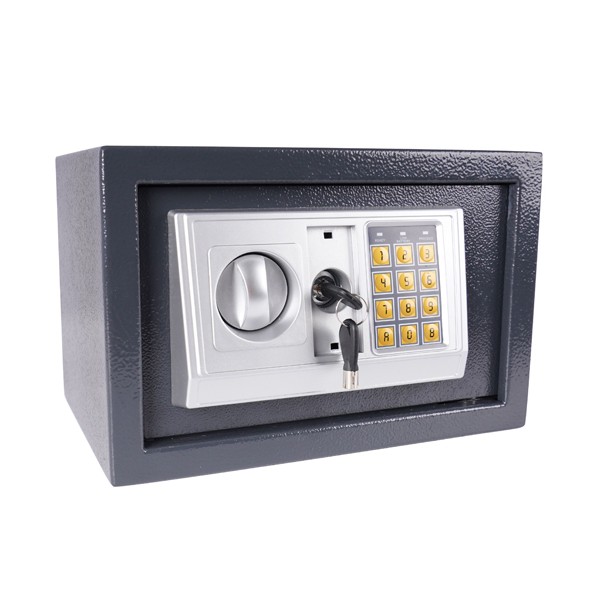 COFFRE FORT ELECTRONIQUE 20EGK - Coffres-fort équipé d'une serrure à combinaison électronique avec un clavier programmable avec des touches de contournement manuelles, ce qui vous permet de définir un code pour le coffre-fort. Si vous avez oublié la combinaison numérique ou si les piles sont vides, vous pouvez utiliser la clé de secours pour ouvrir le panneau à combinaison. La fermeture du coffre-fort est composée de boulons en acier de haute qualité et est très solide. Le coffre-fort peut être facilement fixé au mur ou au sol à l'aide des vis à expansion fournies. Veuillez noter : pour des raisons de sécurité, il est recommandé d'installer le coffre-fort dans une construction de mur/sol en béton. L'intérieur du coffre-fort est recouvert de moquette pour mieux protéger vos bijoux contre les rayures et les dommages.
