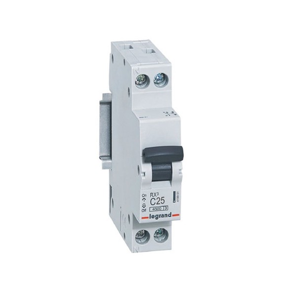 Disjoncteur rx³ 4500 1p+n 230v~ 25a courbe c - 1 module. Disjoncteur RX³4500 Phase + Neutre 230V~ 25A courbe C arrivée haute et sortie basse par borne à vis pour protection des départs - 1 module