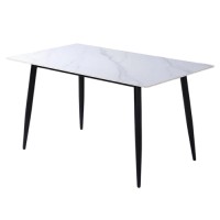 La table de diner REF XX-01 attire le regard à la fois robuste et élégante dans votre maison. Elle est dotée d'un plateau mince d'aspect marbre avec de fins pieds de table en métal noir. Cette table à manger avec plateau aspect marbre est élégante, unique et très robuste. Le dessus de la table à manger est fabriqué en pierre frittée, un matériau robuste, et contient un motif unique et attrayant. La table est disponible en différentes tailles et couleurs. La table convient également pour une utilisation en extérieur.