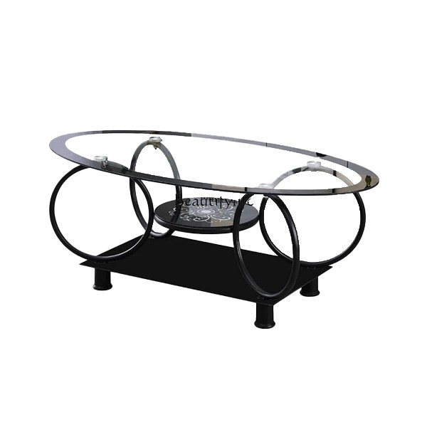 table basse avec une structure en métal et des plateaux en verre. Elle a une forme ovale pour le plateau supérieur et une base rectangulaire pour le plateau inférieur. La table est de couleur noire, avec une incrustation blanche à motifs floraux sur le plateau du milieu. Ses pieds sont également en métal noir.