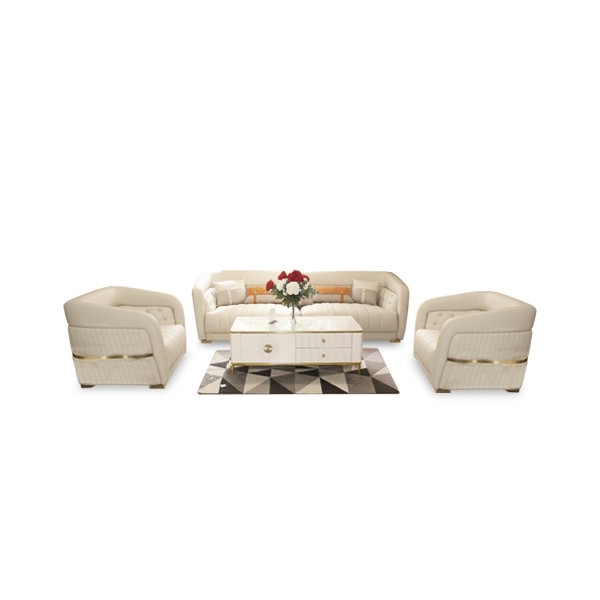 Offrez à votre intérieur une allure sophistiquée avec le Salon complet REF 308, pensé pour les grands espaces et les ambiances raffinées. Son tissu crème capitonné, ses finitions dorées et sa table centrale élégante en font un ensemble aussi fonctionnel que prestigieux.
