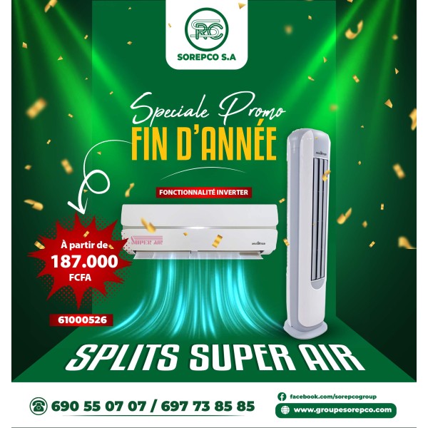 🎉 À partir de 187.000 FCFA, équipez votre maison ou bureau avec les climatiseurs SUPER AIR dotés de la technologie INVERTER pour une performance optimale et une consommation réduite. Pensés pour les climats tropicaux et les usages intensifs, les climatiseurs SUPER AIR intègrent la technologie Inverter, qui ajuste automatiquement la puissance selon la température ambiante. Résultat : un confort constant, une consommation réduite, et une durée de vie prolongée.