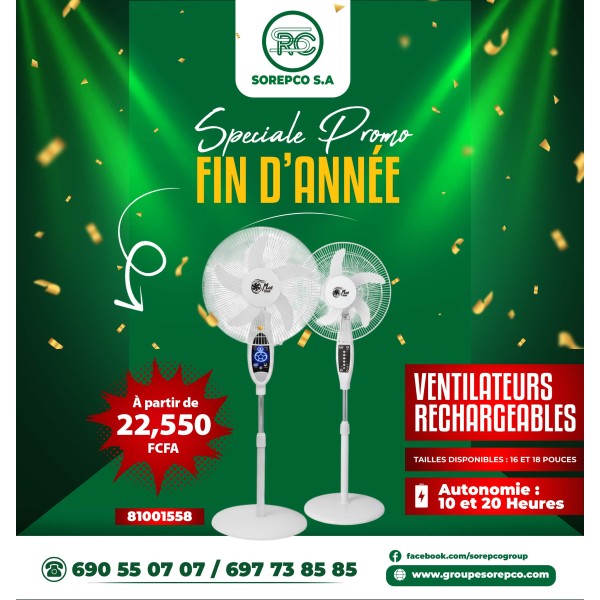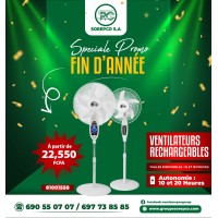 🎉 À partir de 22.550 FCFA, profitez d’un ventilateur rechargeable MAT pour rester au frais, même en cas de coupure de courant. Disponible en 16 et 18 pouces, ces modèles allient puissance, autonomie et élégance. Grâce à leur batterie intégrée et leur design robuste, ils assurent une ventilation continue dans tous les environnements : maison, bureau, commerce ou espace extérieur.