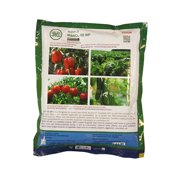 MANCO 80 WP BLEU est un fongicide de contact sous forme de poudre mouillable (WP) qui doit être préparé avec de l’eau pour donner une bouillie applicable par pulvérisation. De la famille des Dithiocarbamates, il agit en préventif tout en offrant une très bonne protection contre de très nombreuses maladies cryptogamiques des cultures maraichères tel que la tomate, le poivron, l’aubergine, le concombre, etc.